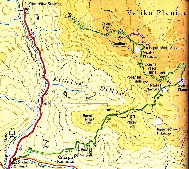 Hay muchísimas más rutas desde esa zona para subir hasta arriba. Para más información aconsejaría informarse en la oficina de turismo de Kamnic o via e-mail http://www.kamnik-tourism.si/También en la página de Velica Planina se puede concertar excursiones: http://www.velikaplanina.si/Groups/Summer/Daily-trips-around-Velika-planina